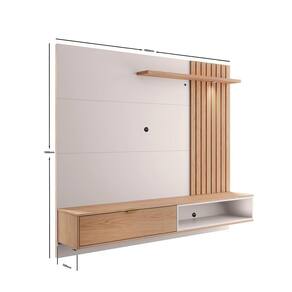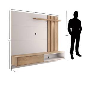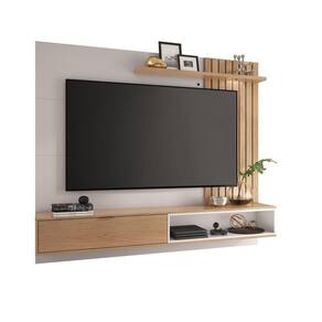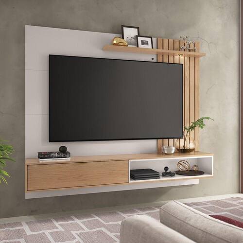 O Painel Tocantins 1.8 charme desse móvel está, principalmente, no ripado em seu painel. Ele é formado com peças maciças que são iluminadas utilizando um spot de LED. Possui uma porta basculante com puxador metálico dourado. Além de extremamente funcional, o painel é amplo e comporta Tvs de até 65 polegadas.