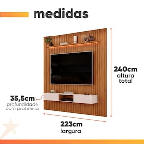 MEDIDAS PAINEL: A = 240 cm L = 223 cm P = 35,5 cm MEDIDAS PRATELEIRA: A = 2,5 cm L = 183 cm P = 15 cm MEDIDAS NICHO: A = 21,2 cm L = 210 cm P = 31 cm PESO SUPORTADO PAINEL: 40 kg PESO SUPORTADO NICHO: 30 kg PRATELEIRA PAINEL SUPORTA ATÉ: 5 kg PESO PAINEL: 71,80 kg PESO NICHO: 19,90 kg IDEAL PARA TV DE ATÉ: 65 Polegadas MODELO: Painel Para TV Até 65 Polegadas 2,23m Ripado Autêntico Com Led e Nicho Montreal MARCA: DJ Móveis COR: Madeirado/Off White PINTURA: UV de alta qualidade, 8 camadas ACABAMENTO: Melamina e PVC MATERIAL: MDP/MDF ESPESSURA DO MATERIAL DA ESTRUTURA: 12 mm e 15 mm PRATELEIRAS PAINEL: 1 PORTAS NICHO: 2 TIPO DE PORTA: Basculante PUXADOR: Cava ESPAÇO PARA PASSAR FIOS: Sim DIFERENCIAIS: Design moderno e sofisticado / Pintura UV de alta qualidade, 8 camadas / Espaço para aparelhos eletrônicos / Nicho com 2 portas basculantes para melhor armazenamento / Painel com ripado autêntico / Prateleira superior extensa com Led / Suportam TV de até 65 polegadas. INSTRUÇÕES E CUIDADOS: Para maior durabilidade, recomendável que a limpeza dos móveis seja feita com pano limpo e seco. Não usar produtos químicos ou abrasivos. GARANTIA: 3 meses pelo fabricante.
