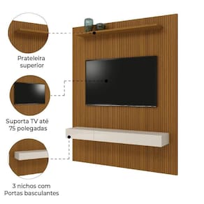 Quer ter sua sala com uma parede toda em detalhe ripado? O Painel para Tv Egeo de 1,80m impressão 3D agrega beleza e elegância ao ambiente. Possui nichos funcionais, ideal para acomodar desde equipamento eletrônicos até objetos de decoração. Lindo e versátil, podendo ser combinado com diversos outros moveis. Seu material de alta qualidade da resistência e durabilidade ao produto, é adequado para televisores de até 75 polegadas. Seu diferencial é o ripado impressão 3D deixando sua ainda mais moderna. MARCA: EDN COR: Cedro/Off White MEDIDAS: A: 216 cm L: 180 cm P: 14 cm MEDIDAS DO NICHO: A: 14 cm L: 160 cm P: 27 cm ACABAMENTO: Fosco ACABAMENTO DO NICHO: Brilhante PINTURA: UV MATERIAL: MDP 15m PORTAS: 2 TIPO DE PORTAS: Basculantes com dobradiças metálicas GAVETAS: Não possui NICHOS: 1 PRATELEIRAS: 1 IDEAL PARA TV DE ATÉ: 75" Polegadas PESO: 57,05 Kg PRATELEIRA SUPORTA ATÉ: 3 Kg PAINEL SUPORTA ATÉ: 50 Kg ACOMPANHA: 1 painel, 1 manual de montagem e kit ferragens. SISTEMA DE MONTAGEM: Girofix GARANTIA: 3 meses DIFERENCIAL: Ripado 3D e com nicho uso opcional. INSTRUÇÕES / CUIDADOS: Limpar com pano levemente umedecido com água e sabão neutro. Montagem não inclusa. Entregamos até a porta de entrada da casa do cliente ou até a portaria do condomínio. MARCA: EDN | COR: Cedro/Off White | ACABAMENTO: Fosco | ACABAMENTO DO NICHO: Brilhante | PINTURA: UV | MATERIAL: MDP 15m | PORTAS: 3 | TIPO DE PORTAS: Basculantes com dobradiças metálicas | GAVETAS: Não possui | NICHOS: 1 | PRATELEIRAS: 1 | IDEAL PARA TV DE ATÉ: 75" Polegadas | PESO: 57,05 Kg | PRATELEIRA SUPORTA ATÉ: 3 Kg | PAINEL SUPORTA ATÉ: 50 Kg | ACOMPANHA: 1 painel, 1 manual de montagem e kit ferragens. | SISTEMA DE MONTAGEM: Girofix | GARANTIA: 3 meses | DIFERENCIAL: Ripado 3D e nichos com uso opcional | INSTRUÇÕES / CUIDADOS: Limpar com pano levemente umedecido com água e sabão neutro. Cor: Cedro