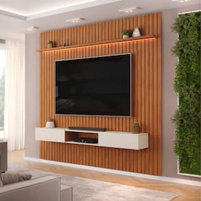 DIFERENCIAIS: Design moderno e sofisticado / Pintura UV de alta qualidade, 8 camadas / Espaço para aparelhos eletrônicos / Nicho com 2 portas basculantes para melhor armazenamento / Painel com ripado autêntico / Prateleira superior extensa com Led / Suportam TV de até 90 polegadas.