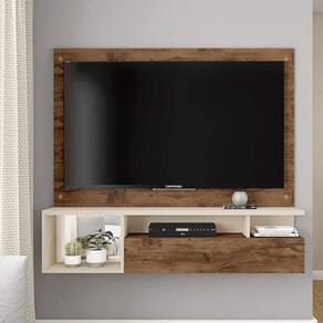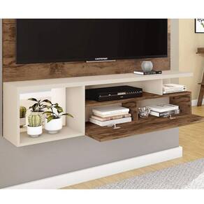 O painel para TV de até 55 Polegadas Black 19, disponível na cor Jatobá/Off White, da Caemmun possui um design moderno e com nichos bem estruturados para acomodar diversos objetos e eletrônicos. Seu design exclusivo e cores naturais bicolor, remetem elegância e requinte ao ambiente da sala de estar ou quartos. Compacto e funcional, o painel possui 136cm de largura, possui tampo em 25mm, nicho com porta basculante com dobradiças metálicas, nicho com espelho e espaço exclusivo para acomodar eletroeletrônicos, auxiliando para melhor organização. Seu tampo e nichos acomodam objetos decorativos com segurança. Produto produzido em MDP de 15 e 25mm. O Painel Black 19 é instalado suspenso, ptimizando o espaço abaixo da bancada.