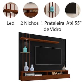 Produzido em mdp de alta qualidade, este painel combina resistência, beleza e funcionalidade. Sua estrutura utiliza peças de 15 mm, além de prateleira superior de 25 mm, prateleira inferior de 30 mm e uma prateleira de vidro que acrescenta elegância ao design. A iluminação led integrada cria um efeito moderno e acolhedor, destacando objetos decorativos e valorizando o ambiente. Com dois nichos e duas prateleiras, o móvel oferece organização prática para eletrônicos, controles e acessórios do dia a dia. O acabamento em pintura uv garante proteção, brilho e maior durabilidade. Por ser suspenso, o painel otimiza o espaço, deixa o ambiente mais clean e acomoda TVs de até 55 polegadas com estilo, eficiência e praticidade.