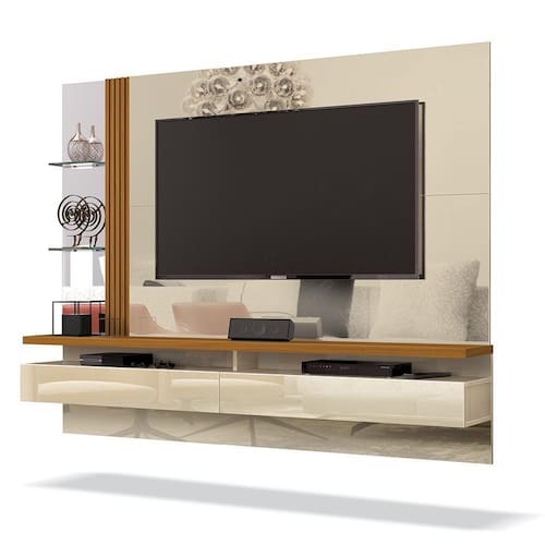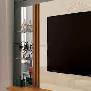 O Painel Murano é lindo e está pronto para deixar a decoração da sua sala mais moderna. Detalhes que se destacam. Ele possui painel ripado na sua lateral que juntamente com o espelho completam o visual do móvel. As portas basculantes ajudam manter a organização do ambiente, sendo ideal para guardar seus pertences. As prateleiras de vidro 8mm, além de agregarem beleza para o produto, permitem que você coloque suas decorações. Esse painel de TV conta com dois nichos para eletronicos, para que não falte espaço para seus objetos. Ideal para TV de até 60. Produzido por madeira MDP com acabamento pintura com secagem ultra violeta (sete camadas) que garante durabilidade e resistencia para o Painel para TV Murano da EDN. Cor: Off White e Cedro