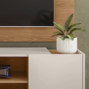 Organização Eficiente: O Rack River oferece espaço interno inteligente com prateleiras e portas para guardar livros, eletrônicos e mais
