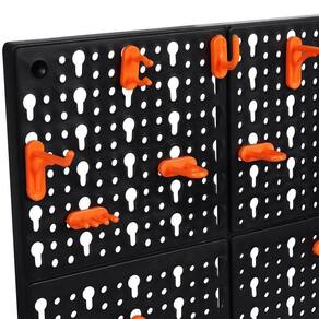 Fabricado com sistema de ranhuras laterais, o painel possibilita a união de múltiplas unidades, ampliando a capacidade de armazenamento conforme sua necessidade. A variedade de ganchos inclusos ? retos, curvos, duplos e tipo olhal ? oferece versatilidade para organizar diferentes tipos de ferramentas de forma prática e segura.