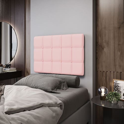 Características do Produto: Madeira de eucalipto proveniente de reflorestamento Fixação com grampos galvanizados Espuma Poliuretano D20 Revestimento: Couro Cor: Rosa Bebê Tamanho: Solteiro Fixação na parede via suportes metálicos. Embalagem: papelão ondulado, malha e plástico Garantia de 3 meses contra defeitos de fábrica.