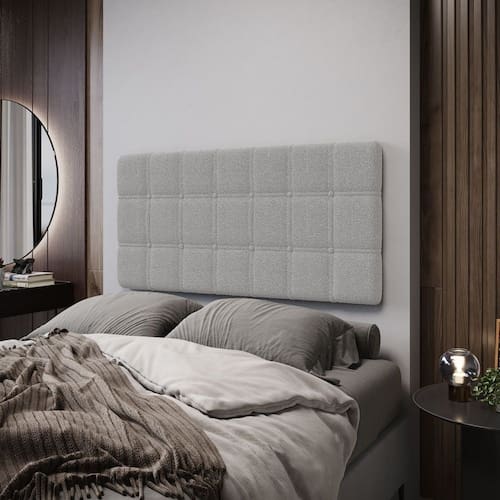 Características do Produto: Madeira de eucalipto proveniente de reflorestamento Fixação com grampos galvanizados Espuma Poliuretano D20 Revestimento: Bouclê Cor: Cinza Tamanho: King Fixação na parede via suportes metálicos. Embalagem: papelão ondulado, malha e plástico Garantia de 3 meses contra defeitos de fábrica.