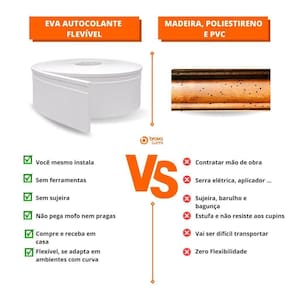 Produzido em borracha EVA, ecologicamente correto, podendo ser molhado sem correr o risco de apodrecer ou pegar cupim, autocolante com cola ultra resistênte, aceita tintas à base de água ou solvente, é flexível e se adapta facilmente a ambientes com curva.