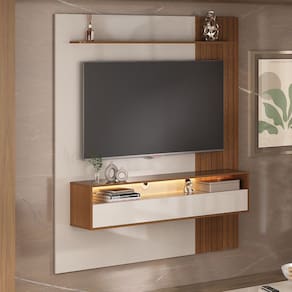 Características: 1 Porta basculante com amortecedor 1 Prateleira com cantos arredondados Acompanha suporte para TV Delicados cantos arredondados no nicho Detalhes ripados em baixo relevo Estrutura resistente de MDF/MDP de 15mm de espessura com pintura UV Fita de LED dentro do nicho Puxador chanfrado Suporta TVs de até 65 polegadas e widescreen de até 72 polegadas