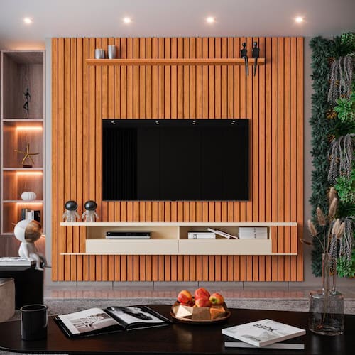 O sofisticado Painel Intense, é uma escolha perfeita para valorizar sua sala de estar. Projetado para TVs de até 75 Polegadas, este painel combina funcionalidade e estilo de forma única. Sua estrutura em MDP confere durabilidade e estabilidade, garantindo que seu televisor esteja seguro e bem acomodado. Com um design premium, o painel Intense irá adicionar um toque de elegância ao seu espaço. Seu acabamento ripado proporciona um visual moderno e contemporâneo, trazendo uma textura única e refinada para a sua sala. Além disso, conta com 2 portas e uma prateleira espaçosa, perfeita para acomodar seus dispositivos eletrônicos, acessórios e itens decorativos. Suas bordas laqueadas conferem um acabamento sofisticado, realçando ainda mais o charme deste painel. Deixando a sua sala de estar ainda mais elegante e atraente. ESPECIFICAÇÕES TÉCNICAS: - Material da Estrutura: MDP; - Acabamento: Ripado; - Número de Porta: 2 Portas; - Número de Prateleiras: 1 Prateleira; - Possui Nichos? Sim; - Ideal para Tvs até ( Polegadas): 75 Polegadas; - Produto Precisa de Montagem? Sim; - Necessita de Fixação na Parede? Sim; - Garantia: 3 Meses; - Instruções de Cuidado: Limpar com pano macio umedecido em solução de água e sabão neutro e secar em seguida.; - Medidas (LarguraXProfundidadeXAltura): 225x27x240cm; - Conteúdo da Embalagem: (1 Painel - Entregue: 3 Volumes). Observações Importantes: Produto não deve ficar exposto diretamente ao sol, calor e umidades excessivas. Recomendações de Limpeza: Utilize somente pano seco ou levemente umedecido. O produto pode sofrer alterações de tonalidade conforme o seu monitor. Imagens meramente ilustrativas, produto não acompanha objetos de decoração e eletrônicos. Ao receber, verifique a embalagem. Se detectarirregularidadeou violação na mesma, recuse o recebimento e nos contate. Não nos responsabilizamos, no ato da entrega, por subir escadas/elevadores. Nós não nos responsabilizamos pela montagem e por problemas causados pela montagem realizada por você ou montador contratado. Enfatizamos a recomendação aos nossos clientes de contratar um montador profissional. Eventualmente, se faltar qualquer móvel ou acessório no produto, nos contate e enviaremos a móvel/acessório sem custo adicional.