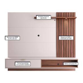 O destaque do Painel Tocantins está no elegante ripado lateral, composto por prateleira e iluminação de LED. Além de seu design charmoso, o painel é altamente funcional, oferecendo capacidade para TVs de até 65 polegadas fixadas com segurança. Completa o conjunto uma porta basculante, adicionando um toque de refinamento ao ambiente. O Painel Tocantins não apenas embeleza sua sala, mas também proporciona praticidade e estilo no seu dia a dia.