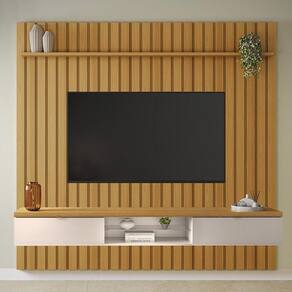 Painel Ripado You Illusion Cinamomo/off White Para Até 70 - Hb Móveis Cinamomo/off White Painel Ripado You Illusion para até 70 - HB Móveis O Painel Ripado You Illusion possui design moderno que deixa o ambiente elegante e valoriza ainda mais a sala de estar. O painel conta com um visual marcante ripado, duas portas basculantes, puxadores em alumínio e uma prateleira superior. ESPECIFICAÇÕES: - Estrutura em MDP e MDF com espessuras de 40mm e 15mm - Pintura UV - Réguas de fixação na parede em MDF - 2 Portas basculantes - Dobradiças metálicas - Prateleira superior - Puxadores em alumínio na cor champanhe - Tampo com espessura de 40mm - Prateleira de vidro 6mm com suportes de silicone - Ideal para até 70