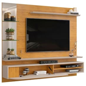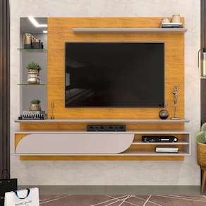 Painel suspenso Ravi que deixa sua sala mais organizada e cheia de estilo. Estrutura em MDF/MDP, suportando televisores de até 60 polegadas (até 40 kg). Possui 1 tampo e 2 prateleiras com bordas chanfradas de 25 mm, passa-fios, 1 torre lateral com espelhos e 2 prateleiras de vidro, além de 1 nicho central com porta basculante curva, equipada com dobradiças metálicas e pistão metálico. Acabamento em pintura UV texturizada fosca e alto brilho. Este móvel chegará em sua casa separado em 01 volume.