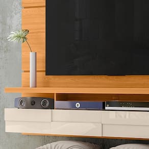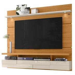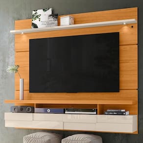 Painel Suspenso Lana, composição funcional de design moderno, iluminação integrada e inteligente dos espaços. Estrutura em MDP de 15/25/40 mm (base 15 mm, prateleira 25 mm e tampo 40 mm), capacidade para TVs de até 60 polegadas (suporta até 47 kg distribuídos). Conta com 2 portas basculantes equipadas por dobradiças metálicas e detalhes em alto relevo, 1 nicho central aberto com passa fios e 2 pequenas luminárias LED embutidas logo abaixo da prateleira superior. Acabamento em pintura UV texturizada (fosco e brilho). Este móvel chegará em sua casa separado em 02 volumes.