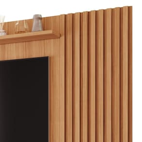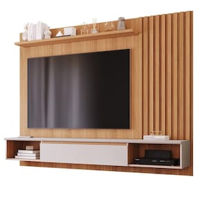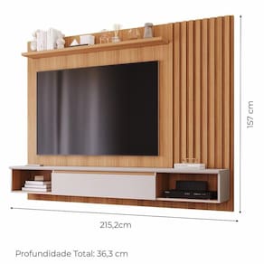O Painel Suspenso Bahamas é um produto 100% MDF. Possui espaço para de até 65 e uma prateleira superior com 2,5cm de espessura para objetos decorativos. O destaque principal fica por conta do aplique ripado na cor do produto. O tampo é espesso com 2,5cm e tem borda chanfrada com acabamento em laca. Possui também nichos inferiores para equipamentos e uma porta basculante para auxiliar na organização da sua sala. A composição de cores traz o requinte do acabamento madeirado nos detalhes deixando prevalecer no produto as cores sólidas e neutras, assim ele pode combinar mais facilmente com qualquer estilo decorativo.