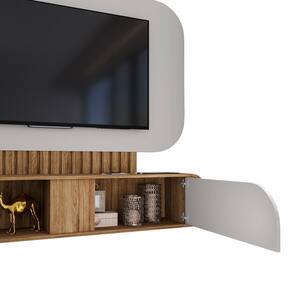 Painel Suspenso Jurerê, design orgânico e atual! Estrutura em MDP/MDF (12/15mm) com acabamento em pintura UV texturizada. Possui nicho central, porta basculante com dobradiças metálicas, puxador estilo Amalfi (plástico), passa fios, detalhes usinadas com bordas curvas e ripados decorativos (MDF 12 mm em baixo relevo). Suporta TVs de até 55 polegadas com segurança. Fixação por meio de parafusos. Este produto será entregue em 1 volume.