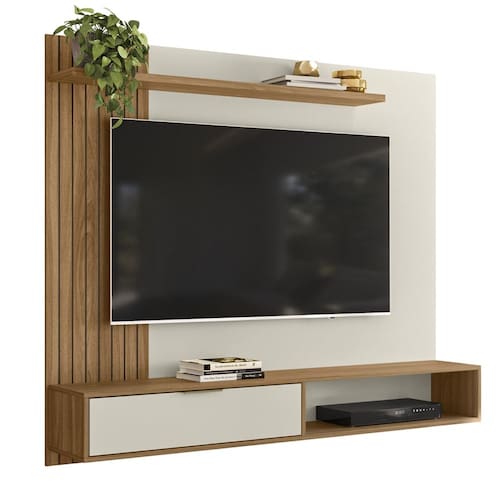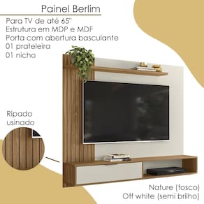 Painel Suspenso Berlim - moderno e funcional. Feito para TVs de até 65", produzido em MDP/MDF que combina resistência e sofisticação. Possui nicho funcional e porta basculante com dobradiças metálicas, para organização de equipamentos e acessórios. Uma prateleira de 25mm garante durabilidade e espaço para decoração. Sua estrutura suspensa otimiza o ambiente, proporcionando conforto e sensação de amplitude. Este móvel chegará na sua casa separado em 01 volume.