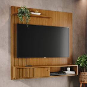 Painel Suspenso Para Tv 65 Polegadas 1 Porta Correr Ariel Cumaru Dimensões do Painel Suspenso para Sala: - Altura: 162 cm - Largura: 160,5 cm - Profundidade: 33 cm Característica do Painel Suspenso para TV de até 65 Polegadas: - Estrutura em mdp de 15 e 25 mm de espessura; - Acabamento de pintura padrão uv; - 1 Porta deslizante; - Painel lateral e porta em MDF frisado (baixo relevo); - Puxador pontual dourado fosco; - Prateleira superior com borda frontal chanfrada; - Espaço para tv: (L x A): 1,605 x 1,100 m; - Para tv de até 65 polegadas respeitando as medidas do espaço; - Não acompanha suporte para fixar tv (Vendido separadamente); - Não acompanha itens ou objetos de decoração;