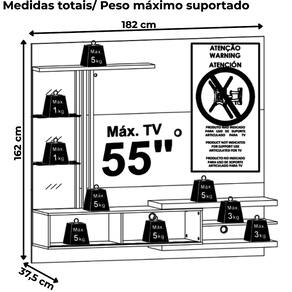 Painel Suspenso Frizz Supreme, com detalhes que transformam seu ambiente. Estrutura em MDP (base 15mm, prateleira/frisos 25mm e tampo 40mm), acabamento em pintura UV texturizada, para TVs de até 55 polegadas. Composto por 2 nichos abertos, passa-fios central, portas de correr de sobreposição com sistema de abertura por trilho plástico e puxadores em plástico. Detalhes de frisos em alto relevo, luminária de LED embutida, espelhos decorativos e 2 prateleiras em vidro (de 5mm). Fixação na parede por meio de parafusos. Este móvel chegará na sua casa separado em 03 volumes.