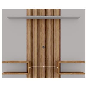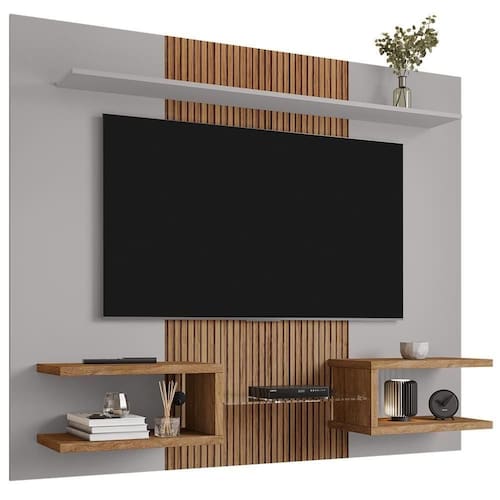 MDP/VidroPainel Suspenso Atlas, modelo moderno alinhando estilo e funcionalidade! Estrutura em MDP (15/25mm) com acabamento em pintura UV texturizada. Possui nichos vazados laterais, prateleira central (vidro 6mm), prateleira superior (MDP 25mm) e detalhe de impressão 3D no MDP, imitando Ripado de madeira. Suporta Tvs de até 55 polegadas com segurança. Fixação por meio de parafusos. Este produto será entregue em 1 volume.