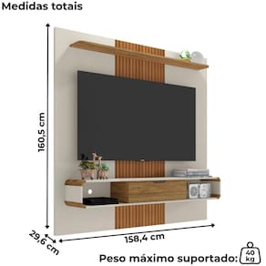 Painel Suspenso Leme, para ambientes modernos e funcionais. Estrutura em MDP (15mm) com acabamento em pintura UV texturizada. Possui tampo, prateleiras (inferior em MDP 25mm) e passa fios, destaque para detalhe de impressão 3D no MDP, imitando Ripado de madeira. Suporta Tvs de até 60 polegadas com segurança. Fixação por meio de parafusos. Este produto será entregue em 1 volume.