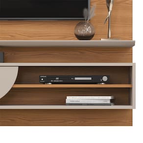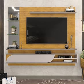 Painel suspenso Ravi que deixa sua sala mais organizada e cheia de estilo. Com estrutura em MDF/MDP que suporta televisores de até 60 polegadas (até 40kg). Possui 1 tampo e 2 prateleiras com bordas chanfradas de 25 mm, passa-fios, 1 torre lateral com espelhos e 2 prateleiras de vidro, além de 1 nicho central com porta basculante curva, equipada com dobradiças metálicas e pistão metálico. Acabamento em pintura UV texturizada fosca e alto brilho. Este móvel chegará em sua casa separado em 03 volumes.