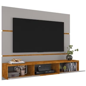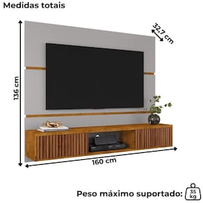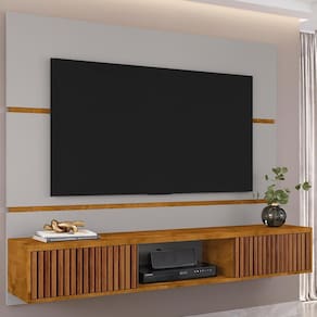 Painel Suspenso Âmbar, perfeito para valorizar sua sala com modernidade e estilo. Estrutura em MDP (15/25mm) com acabamento em pintura UV texturizada. Possui portas com dobradiças metálicas, nicho central, passa fios e detalhe em impressão 3D no MDP que reproduz o efeito de ripado de madeira. Suporta TVs de até 65 polegadas com segurança. Fixação por meio de parafusos. Este produto será entregue em 1 volume.