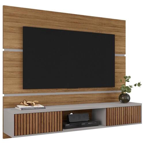 Painel Suspenso Âmbar, perfeito para valorizar sua sala com modernidade e estilo. Estrutura em MDP (15/25mm) com acabamento em pintura UV texturizada. Possui portas com dobradiças metálicas, nicho central, passa fios e detalhe em impressão 3D no MDP que reproduz o efeito de ripado de madeira. Suporta TVs de até 65 polegadas com segurança. Fixação por meio de parafusos. Este produto será entregue em 1 volume.