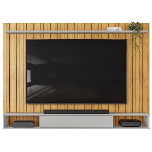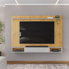Painel Suspenso Rio, a melhor opção para proporcionar um toque especial à sua casa. Estrutura em MDF/MDP para televisores de até 70 polegadas. Conta com detalhe frontal inteiramente ripado, passa-fios (para suportar até 40 kg), 3 nichos, 1 porta de correr com sistema de guia linear (em plástico), 1 prateleira superior extensa. Além de seu acabamento em pintura UV texturizada fosca e alto brilho. Este móvel chegará em sua casa separado em 01 volume.