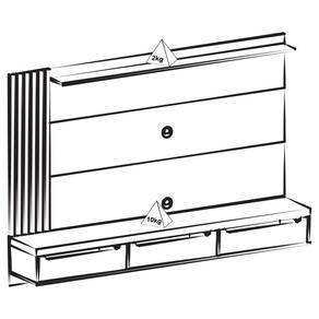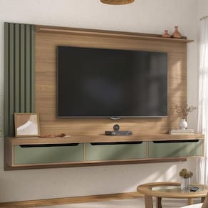 Características adicionais: Para para TV até 75 polegadas, passa fios, 3 gavetas com corrediças telescópicas, puxador embutido, detalhes ripados