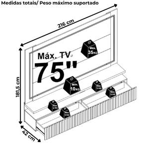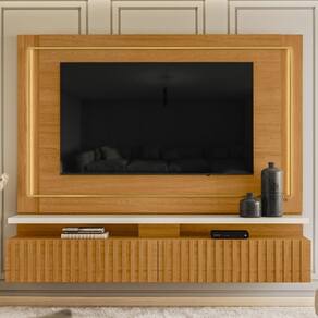 Painel Suspenso Gaia, com design sofisticado e elementos funcionais que valorizam sua sala. Produzido em MDP 15/25/40 mm (base 15/25 mm e tampo 40 mm), ideal para TVs de até 75 polegadas (suporta até 65 kg distribuídos). Conta com 2 gavetas com frente ripada em alto relevo e corrediças telescópicas, 1 prateleira inferior, moldura metálica dourada e 2 fitas de LED embutidas. Possui passa-fios central e inferior. Acabamento em pintura UV texturizada (fosca e brilho). Este móvel será entregue em 03 volumes.