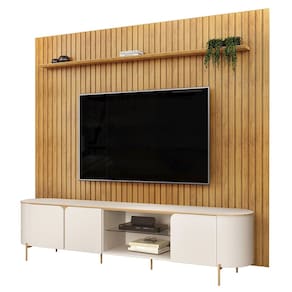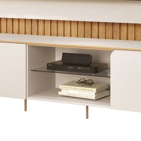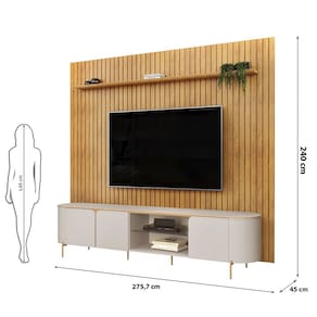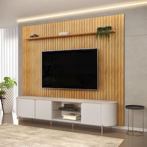 Características: Estrutura em MDF e MDP Acabamento em Pintura PU Cantos arredondados Pés Metálicos Cilíndricos 03 Portas de Giro Usinadas Dobradiças com Amortecimentos Nicho com Prateleira de Vidro Detalhes do Painel Ripado Suporta até 40Kg Ideal para TV até 75 Polegadas