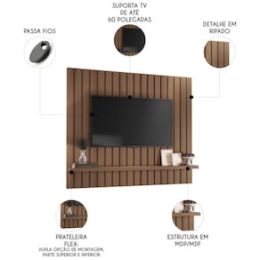 O Painel Para TV é uma ótima opção para quem busca um móvel moderno e sofisticado para a Sala De Estar. Ele possui um ripado que já vem montado de fábrica, garantindo um acabamento perfeito e uma instalação prática. Além disso, ele conta com uma prateleira robusta de 37mm de espessura, ideal para acomodar objetos decorativos. A estrutura do painel é feita em MDP e MDF de alta qualidade, com espessuras de 37mm e 15mm. O Painel Suspenso também oferece uma montagem flex, permitindo que você escolha entre duas opções de utilização, invertendo sua posição na parede e ele suporta TV até 60 polegadas. Você pode usar somente o painel ou pode combinar com bancada, criando um conjunto harmonioso e elegante para o seu ambiente.