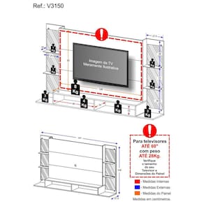 Dimensões do produto montado: Altura: 108 cm | Largura: 191 cm | Profundidade: 31,5 cm Tamanho Painel TV: 136 x 90cm *Devido as variações de tamanho dos televisores no mercado, sugerimos que verifique as medidas da sua TV e compare com o painel antes de efetuar a compra. *Não recomendamos utilizar suporte de TV articulado. *Você pode consultar as medidas internas na imagem técnica do produto.