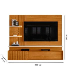 Painel Tv 65 Pol 200cm Bancada Suspensa Ripado Mirellin M20 - D'rossi Cinamomo E Off White Transforme sua Sala de Estar com o Painel para TV Mirellin 200cm, um móvel que combina elegância, funcionalidade e inovação. Com estrutura robusta em MDP de 15 e 25mm e detalhes ripados, ele oferece um visual contemporâneo e acolhedor para o ambiente. Ideal para TVs de até 65 polegadas, o painel acompanha bancada suspensa com duas portas deslizantes, que facilitam o acesso aos compartimentos internos e otimizam a organização. O design ripado e as fitas de LED integradas valorizam o ambiente, proporcionando uma iluminação indireta suave e sofisticada. A bancada conta com prateleiras funcionais, ideais para acomodar aparelhos eletrônicos, objetos decorativos e acessórios do dia a dia. Por ser suspenso, o móvel facilita a limpeza e oferece mais espaço livre no chão, contribuindo para a praticidade e o conforto do lar.Dimensões do Produto: Altura: 168 cm Largura: 200 cm Profundidade: 35 cm Peso: 69 kg Especificações do Produto: Material da Estrutura: MDP Espessuras das Chapas: 15mm/25mm Acabamento: Pintura UV Escala de Brilho: Fosco Peso Suportado: 57 kg distribuídos Suporta TV de até: 65 Polegadas Possui Portas: 2 Portas Tipo de Porta: Deslizante Possui Gavetas: Não Possui Puxadores: Não Possui Prateleiras: Sim Quantidade de Prateleiras: 2 Prateleiras Possui LED: Sim Possui Nichos: Não Possui Passa Fios: Sim Possui Espelho: Não Possui Pés: Não Diferenciais: Painel e portas com detalhes ripados; Fitas de LED integradas; Sistema de portas de correr; Estrutura robusta em MDP. Sistema de Montagem: Girofix, Cavilhas e Parafusos. Manual de Montagem: Sim Complexidade da Montagem: Média Montagem: Recomendamos que seja feita por um profissional Garantia: 90 dias contra defeito de fabricação Instruções de Limpeza: Utilizar um pano limpo e levemente úmido Quantidade de Volumes 2 Caixas Medida das Embalagens Caixa 1: 202,3x32,5x11,7cm; Caixa 2: 202,7x53,5x11,3cm Entrega: É feita somente até o térreo ou portaria. Confira sempre as medidas das embalagens para assegurar que o produto passe por portas e escadas do local.