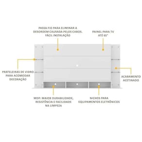 Produzido em MDP com acabamento acetinado, que garante maior durabilidade e facilidade na limpeza, possui painel para TV de até 65 com espaçamento para a passagem dos fios, o que deixa um visual mais clean e os cabos organizados. Possui 4 prateleiras em vidro, que deixam o móvel mais requintado e 2 nichos para acomodar os equipamentos eletrônicos.