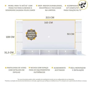 Prático e moderno para deixar sua sala de estar confortável para aproveitar o aconchego do seu lar. O Painel TV até 65 polegadas com suporte, espelho e prateleiras vidro Nairóbi Multimóveis é uma escolha inteligente e super em conta para deixar o seu ambiente bonito e organizado. Produzido em MDP com acabamento acetinado, que garante maior durabilidade, resistência e facilidade na limpeza, possui painel para TV de até 65 com espaçamento para a passagem dos fios, o que deixa um visual clean e os cabos organizados. Possui 4 prateleiras em vidro, com detalhes em espelho, que deixam o móvel mais requintado e 3 nichos para acomodar os equipamentos eletrônicos. Os espelhos são de vidro (o que evita que a imagem fique distorcida) e lapidados, ou seja, passam por um processo para que as bordas não fiquem cortantes, o que garante maior segurança. Para facilitar a sua vida, este produto acompanha também o kit para fixação da TV. Muito prático e de fácil instalação, pode ser utilizado para TVs LCD, LED e plasma de 14 a 71. Totalmente sobreposto, acompanha gabarito de montagem que auxilia na instalação. Conta com um sistema de encaixe rápido, possui 16mm de deslocamento que permite o ajuste do encaixe das peças.