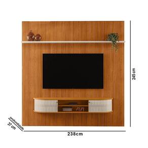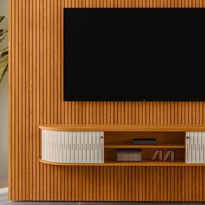 Painel Tv 75 Pol 238cm Kalven E Bancada Suspensa Aurenzo M20 - D'rossi Cinamomo(fosco)/off White(brilho) Transforme sua sala com o Conjunto Painel TV 75 Pol 238cm e Bancada Suspensa Aurenzo 183cm. Com um design contemporâneo e sofisticado este conjunto acomoda TVs de até 75 polegadas, perfeito para quem deseja unir estilo e funcionalidade em um único ambiente. O Painel Kalven possui acabamento europeu, com MDF frisado em baixo relevo e curvas suaves que agregam movimento e elegância ao móvel. Já a Bancada Suspensa Aurenzo complementa o conjunto. As portas curvas deslizantes e os puxadores em poliestireno garantem leveza, praticidade e um visual moderno. A prateleira interna acomoda aparelhos eletrônicos, enquanto o sistema suspenso facilita a limpeza do ambiente. Esse conjunto é a escolha ideal para quem busca um ambiente contemporâneo, bem organizado e com um toque de sofisticação. Perfeito para valorizar sua sala e oferecer mais conforto, funcionalidade e estilo no dia a dia. Dimensões: Altura: 245 cm Largura: 238 cm Profundidade: 37 cm Peso Total: 95 kg Especificações do Produto: Material da Estrutura: MDP/MDF Espessuras das Chapas: 15mm/25mm Acabamento: Pintura UV Escala de Brilho: Brilho/Fosco Peso Suportado Painel: 38 kg distribuídos Peso Suportado Bancada: 15 kg distribuídos Suporta TV de até: 75 Polegadas Possui Prateleiras: Sim Quantidade de Prateleiras: 2 Possui Gaveta: Não Possui Nicho: Não Possui Portas: Sim Quantidade de Portas: 2 Tipo de Porta: Deslizante Possui Puxador: Sim Material do Puxador: Poliestireno Possui Pés: Não Possui LED: Não Possui Passa-Fios: Sim Diferenciais: Painel frisado em MDF; Estrutura resistente em MDP/MDF; Prateleira integrada; Passa-fios; Portas curva deslizantes flexíveis Sistema de Montagem: Minifix Manual de Montagem: Sim Complexidade da Montagem: Alta Montagem: Recomendamos que seja feita por um profissional Garantia: 90 dias contra defeito de fabricação Instruções de Limpeza: Utilizar um pano limpo e levemente úmido Quantidade de Volumes: 4 Caixas Medida das Embalagens do Painel: Caixa 1: 238x18x15,2cm; Caixa 2: 246,5x61,1x3,2cm; Caixa 3: 246,5x62,3x3,2cm Medida das Embalagens da Bancada: Caixa 1: 187,7x35,3x10,7cm Entrega: É feita somente até o térreo ou portaria. Confira sempre as medidas das embalagens para assegurar que o produto passe por portas e escadas do local.