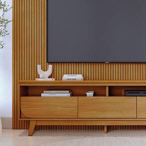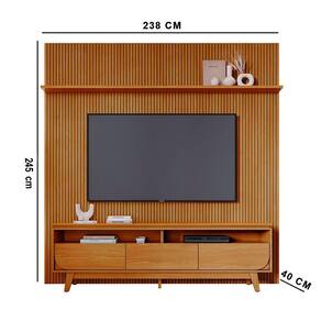 Painel Tv 75 Pol 238cm Ripado Kalven E Bancada Elarin M20 - D'rossi Cumaru(fosco) Transforme sua sala com o Painel TV 75 Pol 238cm Ripado Kalven e Bancada Elarin. Estrutura em MDF e MDP (12, 15 e 25mm) de alta resistência. Painel em MDF com acabamento ripado em baixo relevo, que destaca a sofisticação do design. A bancada possui tampo superior chanfrado de 25mm, 3 gavetas com corrediças telescópicas, sendo as laterais com design curvo para maior sofisticação e pés usinados. Ideal para quem busca funcionalidade, durabilidade e estilo contemporâneo. Produto robusto, de fácil instalação e indicado para TVs de até 75?. Design moderno que valoriza o ambiente com organização, elegância e acabamento de alto padrão. Dimensões: Altura: 245 cm Largura: 238 cm Profundidade: 40 cm Peso Total: 128 kg Especificações do Produto: Material da Estrutura: MDP 15mm/ 25mm Acabamento: Pintura UV Escala de Brilho: Fosco/Brilho Peso suportado do Painel: 38 kg distribuídos Peso suportado da Bancada: 50 kg distribuídos Suporta TV de até: 75 Polegadas Possui Prateleiras: Sim Quantidades de Prateleiras: 1 Prateleira Possui Gavetas: Sim Quantidades de Gavetas: 3 Gavetas Material das Corrediças: Telescópicas Possui Nichos: Sim Quantidade de Nichos: 2 Nichos Possui Portas: Não Possui Puxador: Não Possui LED: Não Possui Espelho: Não Possui Passa-Fios: Sim Possui Pés: Sim Tipo de Pés: Pés usinados em Madeira Maciça Diferenciais: Design moderno; Painel frisado em MDF; Tampo da bancada com borda chanfrada; Gavetas laterais com detalhe curvo. Sistema de Montagem: Cavilhas/Parafusos/Minifix Manual de Montagem: Sim Complexidade da Montagem: Alta Montagem: Recomendamos que seja feita por um profissional Garantia: 90 dias contra defeito de fabricação Instruções de Limpeza: Utilizar um pano limpo e levemente úmido Quantidade de Volumes: 5 Caixas Medida das Embalagens: Caixa 1: 238x18x15,2cm; Caixa 2: 246,5x61,1x3,2cm; Caixa 3: 246,5x62,3x3,2cm; Caixa 4: 67,5x50,5x12,7cm; Caixa 5: 201,9x37,9x9,6cm Entrega: É feita somente até o térreo ou portaria. Confira sempre as medidas das embalagens para assegurar que o produto passe por portas e escadas do local.