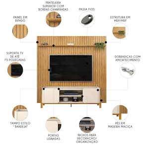 O Painel Ripado feito em MDF e acabamento em pintura UV, ele combina durabilidade. A prateleira, com borda chanfrada, é ideal para exibir objetos decorativos, enquanto o Painel suporta TVs de até 75 polegadas, assegura segurança e estilo ao ambiente. O sistema de passa-fios integrado mantém os cabos organizados e fora de vista, proporcionando um visual elegante. O Rack Bancada, com design moderno, acomoda TVs de até 65 polegadas e oferece funcionalidade com charme. Seu tampo espaçoso, com cantos curvos e recuados, é complementado por cantoneiras arredondadas e duas portas elegantes, que proporcionam organização eficiente. O nicho central amplo, com prateleira, é perfeito para eletrônicos, enquanto os pés em madeira maciça garantem robustez e sofisticação. Além disso, os pés elevados facilitam a limpeza, e o passa-fios integrado mantém a estética impecável.