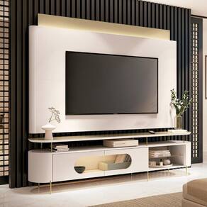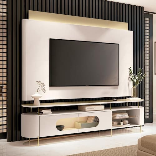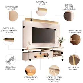 O painel possui bordas laterais arredondadas e iluminação LED embutida na parte superior, criando um efeito de luz indireta que valoriza o ambiente com suavidade e charme. Sua estrutura suporta televisores de até 85 polegadas com segurança e estilo.