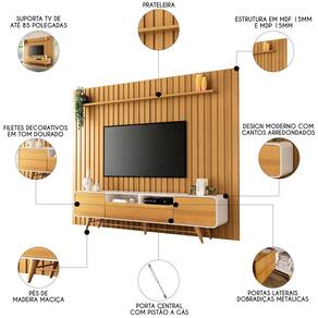 Características do Produto Material da estrutura: MDP/MDF 15mm. Acabamento: Pintura UV. Escala de Brilho: Brilhante/Fosco. Peso Suportado: 50 kg no Rack, 50 kg no Painel, ambos distribuídos. Suporta TV de até: 85 Polegadas. Quantidade de Portas: 3 Portas. Tipo de Porta: 2 Convencional/1 Basculante. Tipo de Dobradiças: Metálicas/Pistão a gás. Possui Puxador: Não. Possui Gavetas: Não. Quantidade de Nicho: 2 Nichos. Quantidade de Prateleiras: 1 Prateleira. Possui LED: Não. Possui Pés: Sim. Material dos Pés: Madeira Maciça. Possui Passa Fios: Sim. Diferenciais: - Design clean e moderno, com cantos arredondados. - Porta central com pistão a gás - Portas com abertura fecho toque e filetes decorativos em tom dourado. Sistema de Montagem: Parafusos/Cavilhas/Minifix. Manual de Montagem: Sim. Complexidade da Montagem: Média. Volumes: 4 Volumes. Conteúdo da Embalagem: 1 Rack Bancada, 1 Painel Ripado. Garantia do Fabricante: 90 dias contra defeito de fabricação. Montagem: Recomendamos que seja feita por um profissional. Recomendação de Limpeza: Utilize pano levemente úmido.