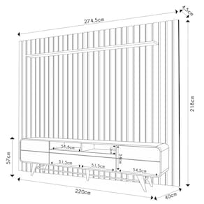 Dimensões dos Produtos Rack Áureo: 220 x 57 x 40 cm. Painel One: 274,5 x 218 x 4,5 cm. Peso: 143 kg total.