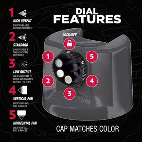 - O mostrador personalizado 5 em 1 oferece cinco padrões de tinta spray para o máximo controle e resultados superiores