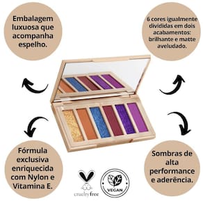 Modo de uso:Com um pincel de sua preferência, aplique a sombra uniformemente sobre as pálpebras e esfume delicadamente até obter o efeito desejado. Para uma performance ainda melhor experimente use as sombras por cima de uma base ou primer.