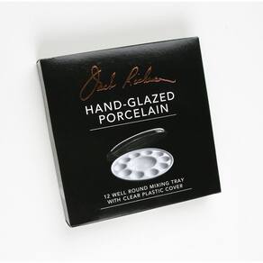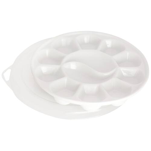 Este paleta de porcelana 12 bem redondo mede 7 1/2 de diâmetro e 1 alto com uma capa de plástico transparente para manter tintas úmidas durante o café quebra.