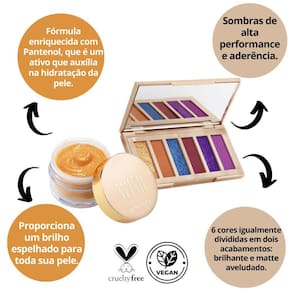 A Paleta Wish po Bruna Tavares é uma paleta de sombras inspirada nas cores da belíssima fotografia da animaçãoDisney Wish. Com fórmula exclusiva de BT ela conta com seis tonalidades divididas em acabamento brilhante e matte aveludado. Sua fórmula é enriquecida com Nylon e vitamina E, garantindo flexibilidade, aderência e alta performance para as sombras.