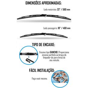 2. Qual o tamanho das palhetas? A palheta do lado do motorista possui 22 polegadas 560mm e a do lado do passageiro possui 18 polegadas 460mm .