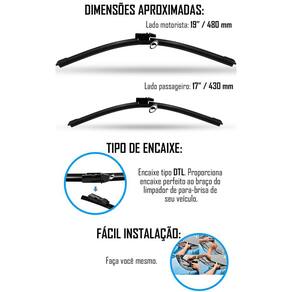 As palhetas possuem 19 polegadas 480mm para o lado do motorista e 17 polegadas 430mm para o lado do passageiro.