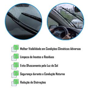 Essas palhetas também são eficientes na remoção de insetos e resíduos do para-brisa, especialmente quando utilizadas em conjunto com o esguicho de água. Dessa forma, você pode remover facilmente essas sujeiras que podem se acumular durante a condução, garantindo uma visão limpa e desobstruída da estrada.